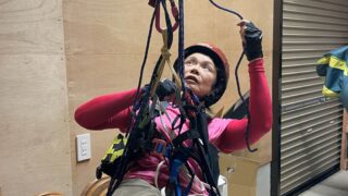 風の悪い日は倉庫内でツリー講習 クライミングハーネスをつけ忘れたので、ついでにパラハーネスでの脱出練習も久々に(^^)v これも大事な練習ですね♪