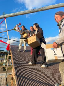 あいみ倉庫の棟上げ式 Blog 2025.02.132025.01.30 あいみ倉庫&自宅の棟上げ式 奄美の伝統にのっとって棟梁のN兄指導の元屋根に上がりました 屋根の上でお神酒を頂戴しました 最後は恒例の餅投げをしました(*^^*) 無事に建ちますように
