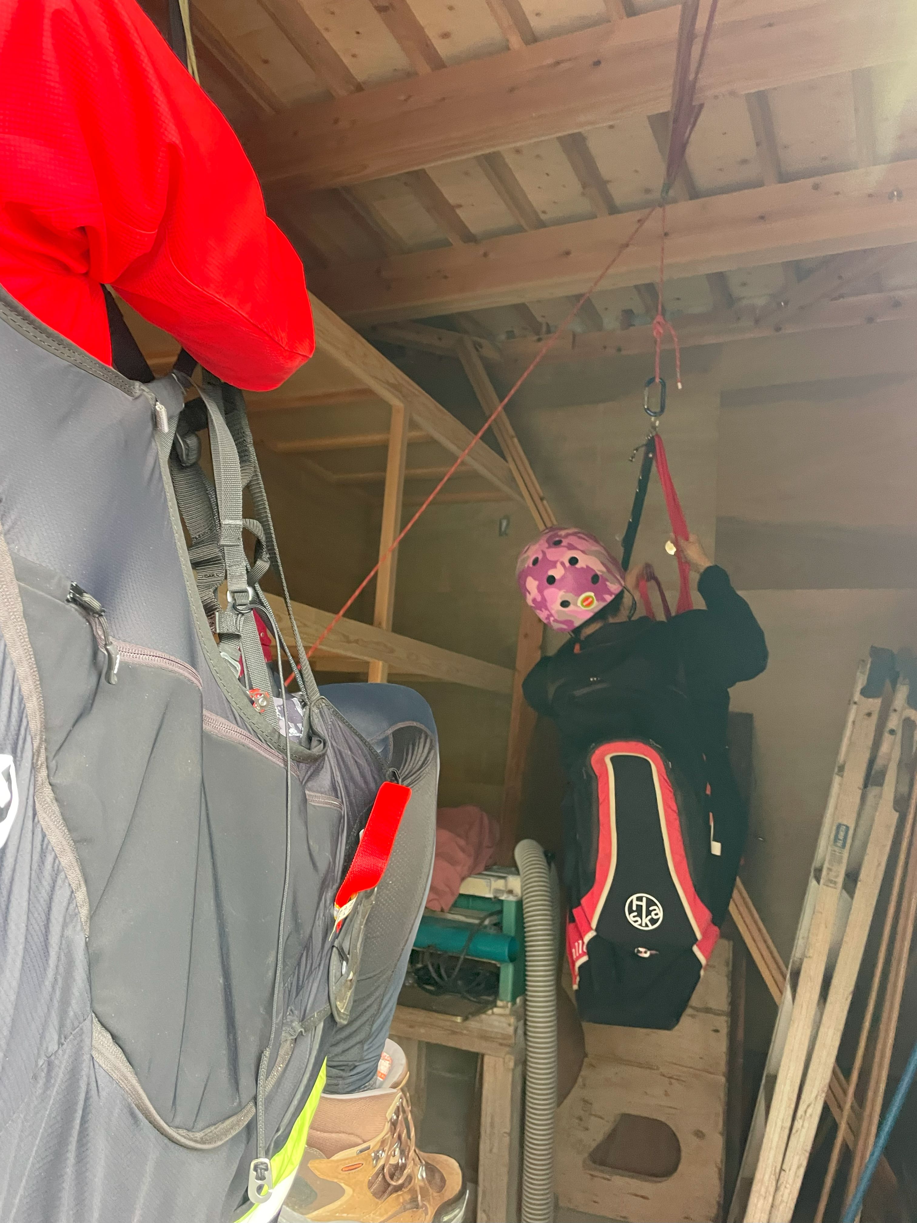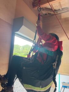 まずはギアの理解とセルフビレイの取り方など、救助を待つ間の体勢の取り方を習いました。