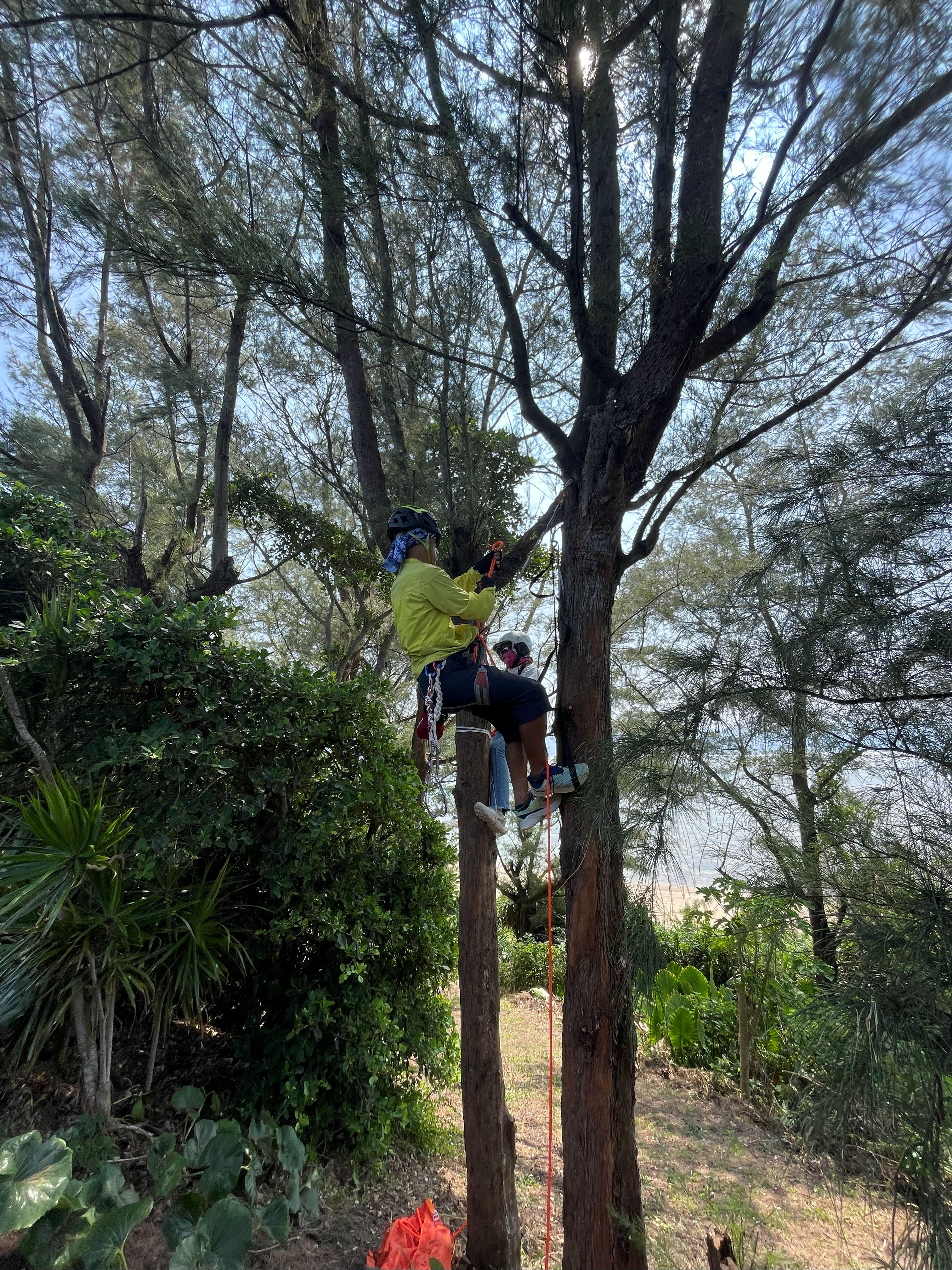 一通り脱出練習が終わったら海岸沿いのモクマオウにて木登り講習