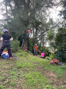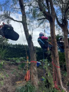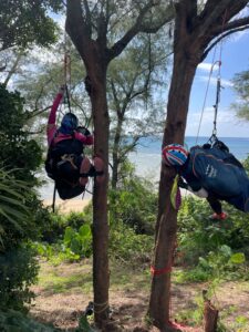 近所の海に出る道横にあるモクマオウに登ったり、ツリーラン時の体勢の立て直しの練習や、自分で脱出するセルフレスキューの練習を各自頑張りました♪